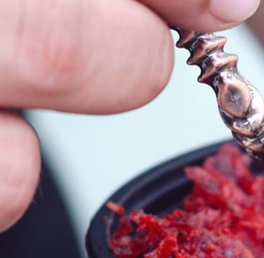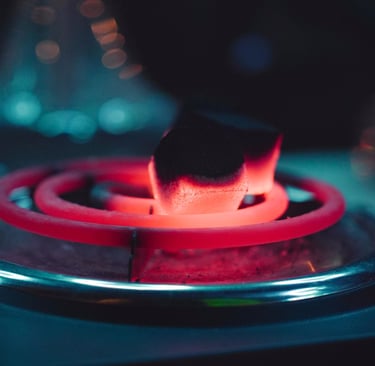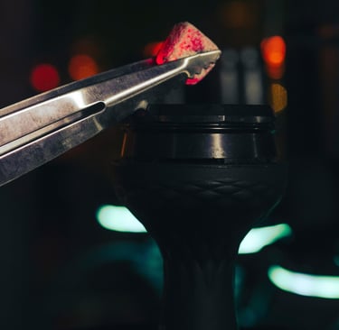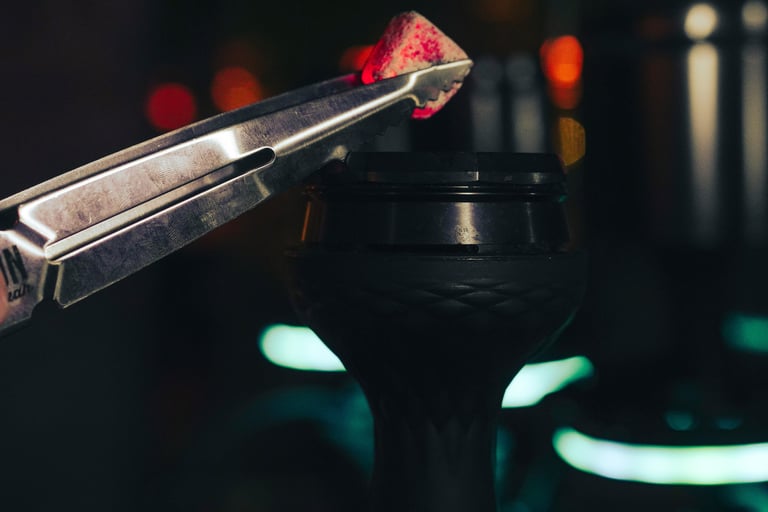 Coloca el carbón: usando pinzas, pon el carbón dentro del dispositivo de gestión de calor. Por reloj a los 8min tu hookah estará lista. No aspires antes de este tiempo ya que el tabaco no estará 100% encendido y correrás el riesgo que la esencia se pegue al dispositivo de aluminio.